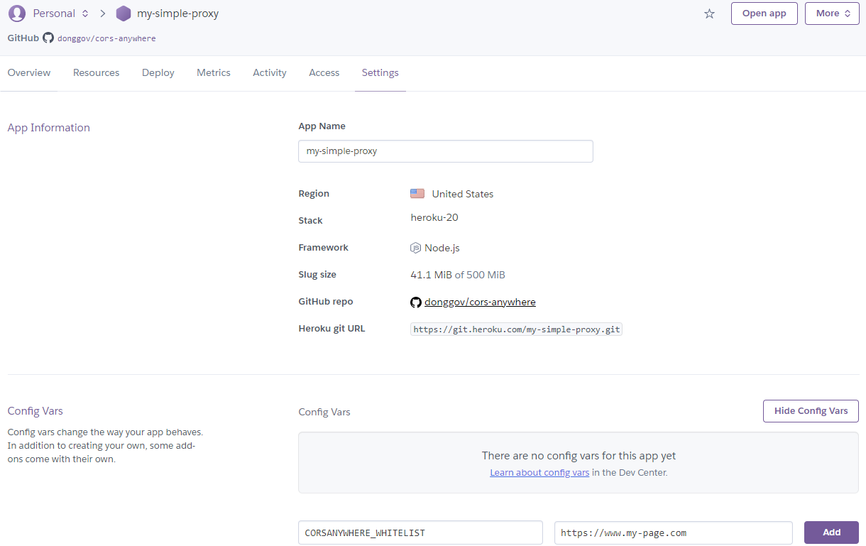 Heroku 내, Settings > Config Vars에서 환경변수를 설정할 수 있다. KEY에 CORSANYWHERE_WHITELIST를 입력하고, WHITELIST 처리할 url을 적어준다.