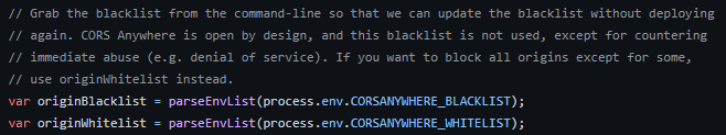 CORS Anywhere server.js 소스를 까 보면 환경변수로 WHITELIST를 설정할 수 있게 해 논 걸 볼 수 있다.