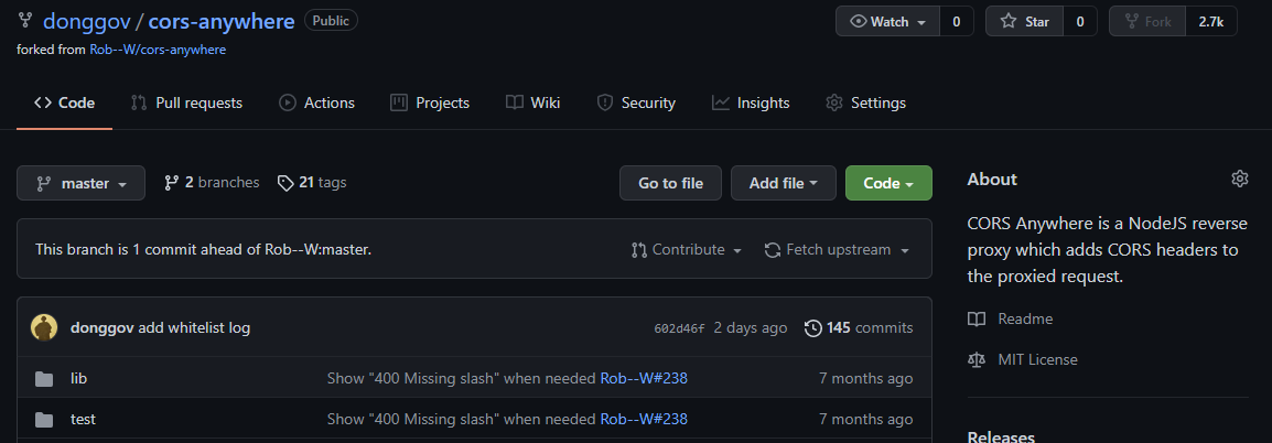 CORS Anywhere는 프록시 된 요청에 CORS 헤더를 추가하는 NodeJS 프록시다. MIT 라이선스로 자유롭게 사용할 수 있다. whitelist, blacklist, rate limit 등의 다양한 설정도 간단하게 할 수 있다.