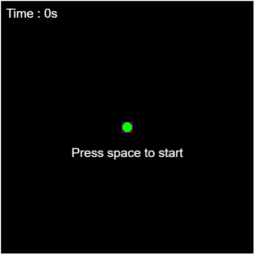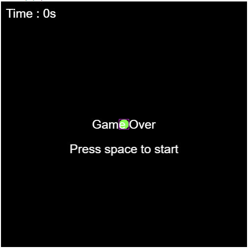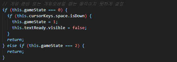 space를 누르면 게임 상태를 1(플레이)로 변경해보자. space는 this.cursorKeys.space.isDown로 입력받을 수 있다. 아래처럼 게임 준비 중일 때 space를 누르면 게임 상태를 1로, 게임 준비 텍스는 출력 안되도록 설정한다.
