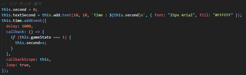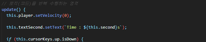 아직 화면에는 시간이 변하지 않습니다. 아래처럼 update 함수에 코드를 추가합니다. update 함수에서 시간 텍스트를 바꿔줍니다.