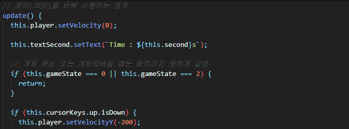 플레이어는 게임 플레이 상태에서만 움직여야 합니다. update 함수 내 플레이어 움직임 코드 위에 아래 조건을 추가합니다.