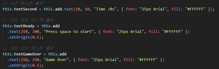 create 함수에 아래처럼 시간, 게임 준비, 종료 텍스트를 추가합니다. setOrigin로 기준 축을 설정할 수 있습니다.