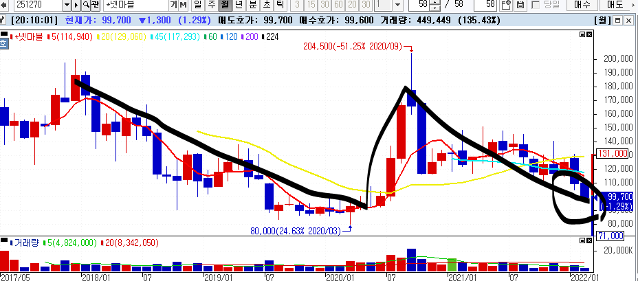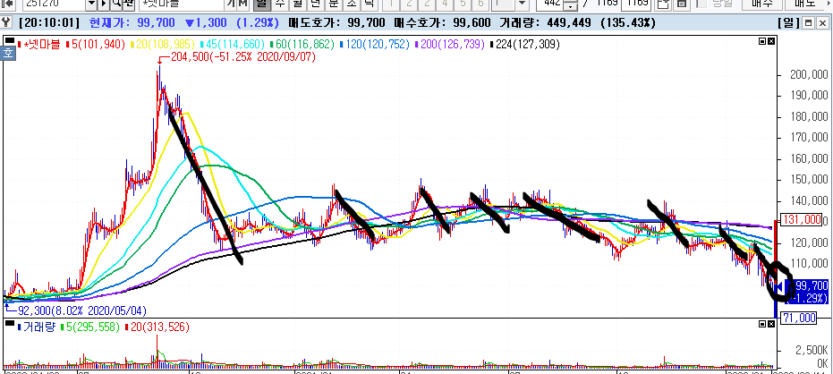 이건 일봉이 200선 아래에서 놀다가 200선을 이제막 터치한거라 불안불안함