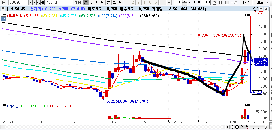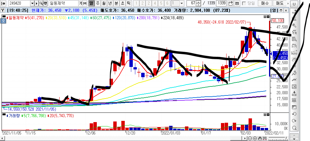 저점에서 고점을 상한가로 한번에 밀어버리면서 올라감