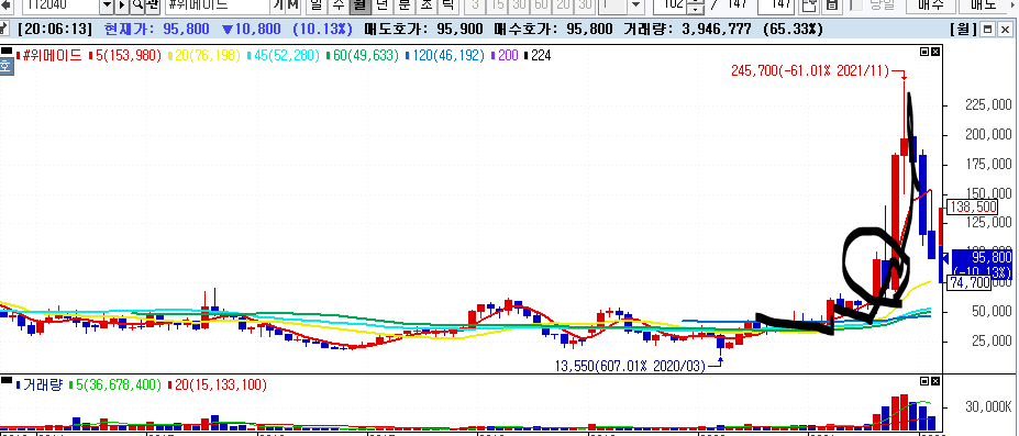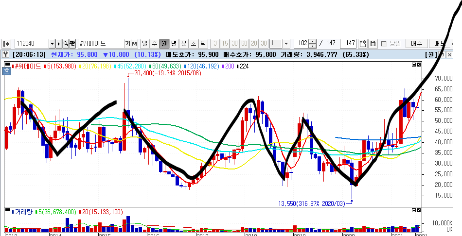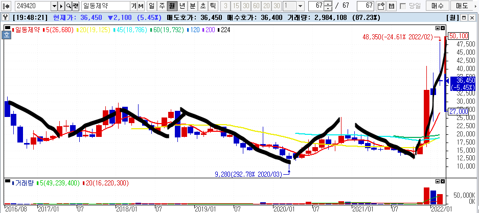 폭등직전 몇년간 박스 그리다가 거래량 터트리면서 길게 양봉 뽑고 직진