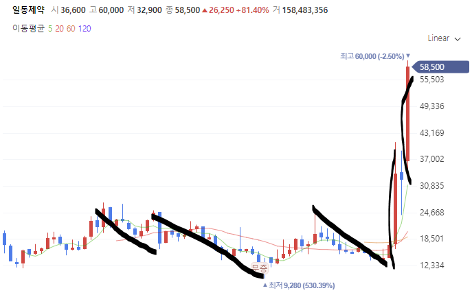 일동제약. 월봉을 보면 박스 하단에서 박스권을 돈으로 한번에 뚫어버리는 모습