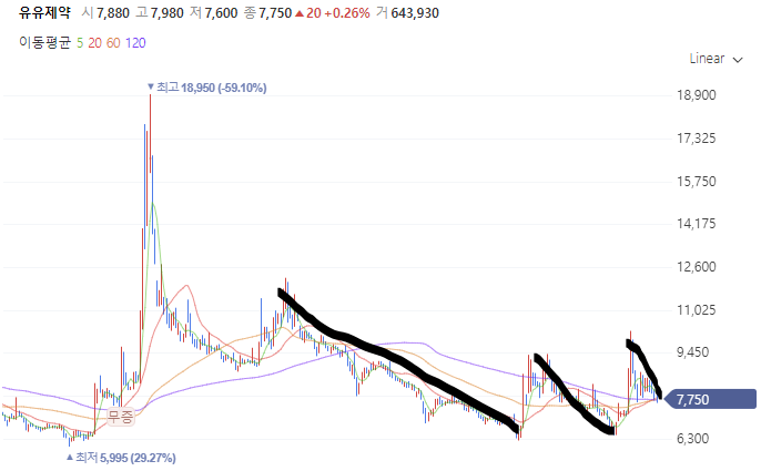 유유제약. 일봉 이평선은 모였는데 월봉 이평선이 아직 벌어지지 못했네