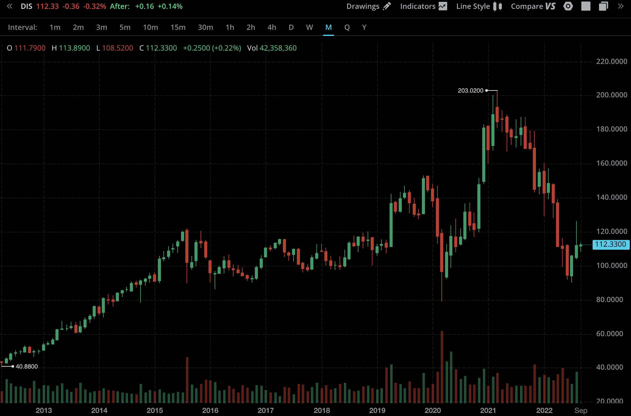 한때 주주였던 디즈니 주가를 오랜만에 봤는데... 코로나 전보다 더 떨어져있다.