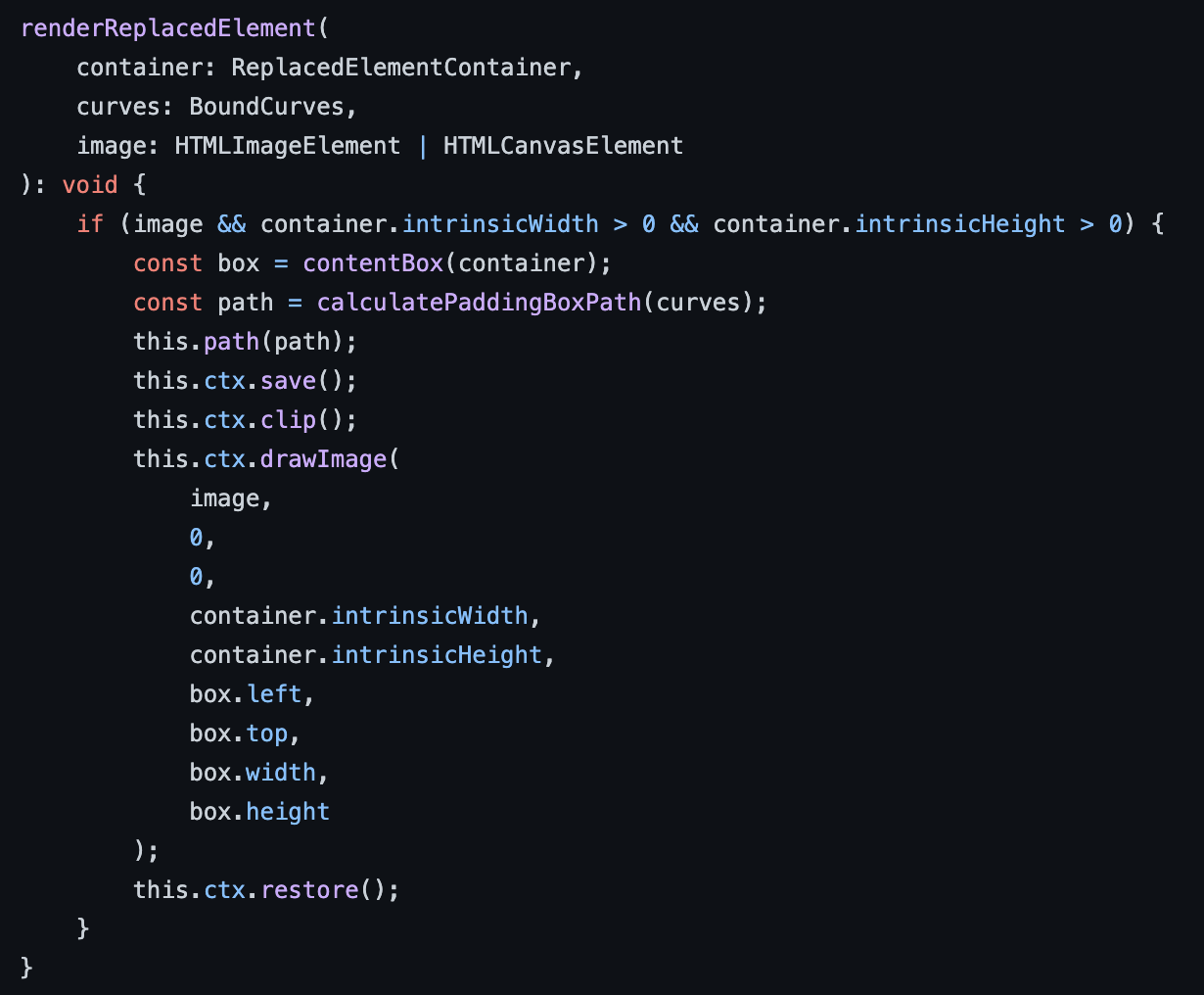 renderReplacedElement는 이미지를 캔버스로 그리는 함수이다. image element 뿐만 아니라 canvas, svg element 모두 이 함수를 사용하여 처리하고 있다.