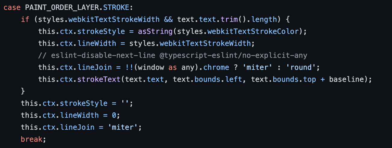 텍스트 렌더 부분 코드를 살펴보면 fillText, strokeText를 사용하여 캔버스에 텍스트를 그리고 있는 걸 볼 수 있다.