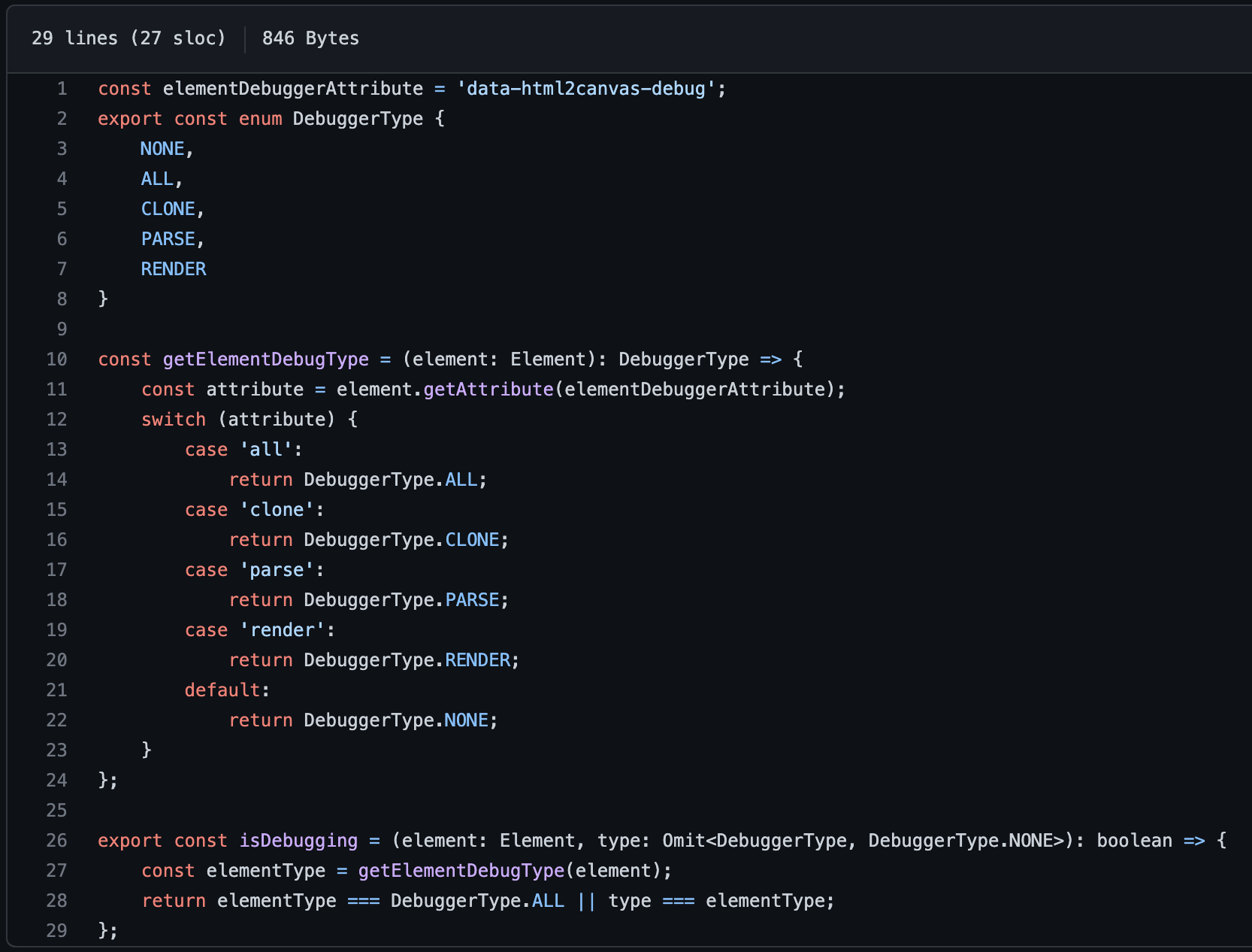 DOM과 스타일을 적용하여 캔버스 이미지로 그린다고 되어있다. 실제 사용법도 간단하다. 캡처 대상 element와 옵션만 설정하면 promise로 캔버스를 반환한다. jspdf 라이브러리를 통해 화면을 통째로 PDF로 내보낼 때도 이 오픈소스를 이용하기도 한다. (참고. 자바스크립트로 PDF 내보내기) html2canvas는 어떻게 element를 캔버스로 만들고 있는지 코드를 살펴보았다. 코드는 v1.4.1 기준이다.