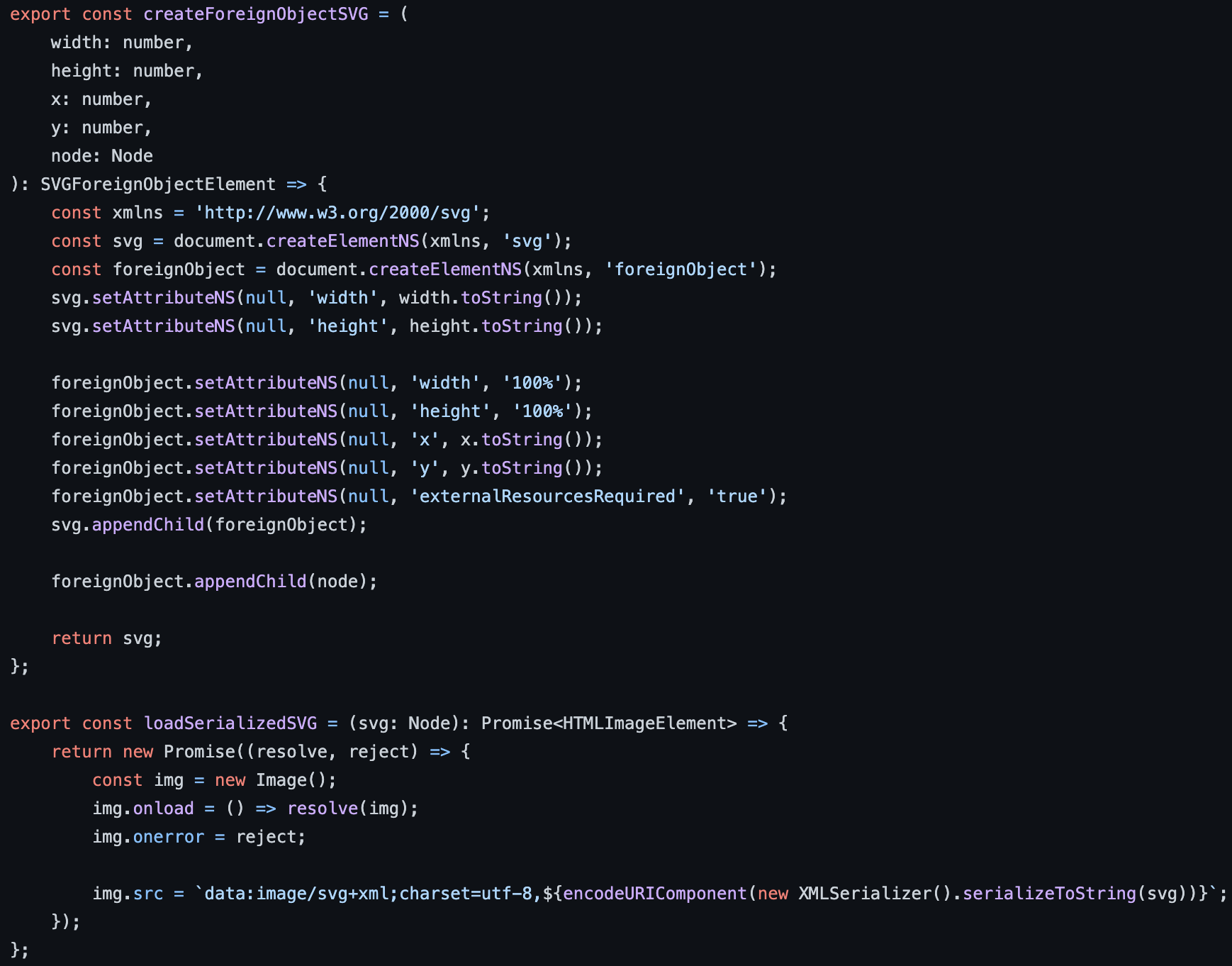 svg와 foreignObject element를 동적으로 만들고 노드를 foreignObject에 바인딩한다. 그리고 loadSerializedSVG 함수에서 svg 노드를 XMLSerializer로 직렬화 및 인코딩하여 이미지가 로드되면 반환한다.