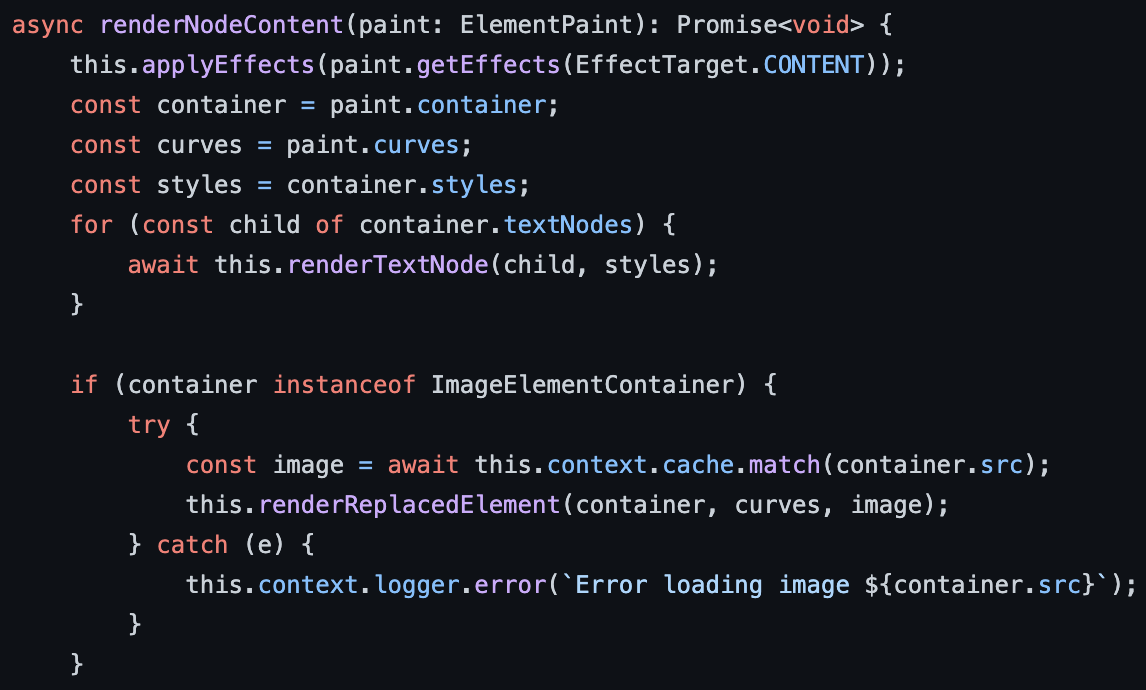 node 파싱 모드는 CanvasRenderer를 사용한다. node 파싱 모드는 element 타입에 따라 분기 처리되고 있지만, 코드를 따라가 보면 모두 fillRect, fillText, drawImage 등 캔버스 API를 사용하여 캔버스를 그리고 있다.