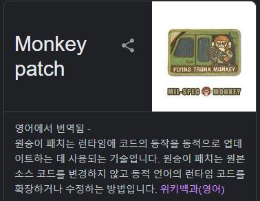 몽키패치는 원래 소스코드를 변경하지 않고 실행 시 코드 기본 동작을 추가, 변경 또는 억제하는 기술이다. 쉽게 말해 어떤 기능을 위해 이미 있던 코드에 삽입하는 것이다.