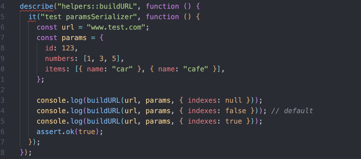 코드 내에서 직렬화를 실제로 수행하는 건 buildURL 함수이다. 아래처럼 테스트 코드를 작성하여 buildURL 함수를 실행해보면