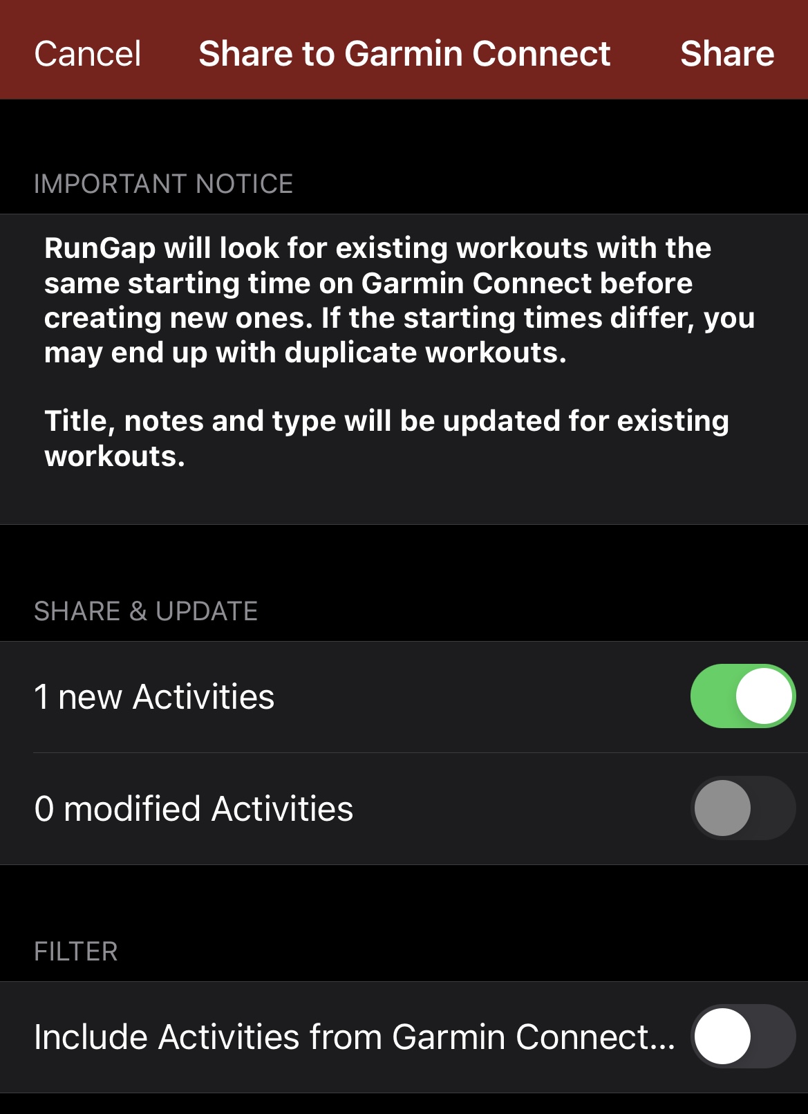 가민 선택하면 어떤 활동을 가민으로 내보내기 할 건지 묻는다. 신규 1건에 활성화되어 있는 상태고 오른쪽 위에 Share 터치하면 끝