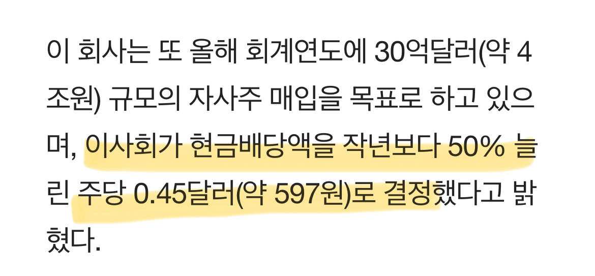 배당금을 작년보다 50% 늘린다고 한다. 그래봤자 주당 1달러도 안 되는 금액인데 배당금을 늘린다는 거 자체가 주주들에게 큰 의미가 있다. 코로나 터지고 배당을 없앤 걸로 알고 있었는데 배당을 주긴 줬나 보네.