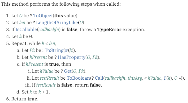 자바스크립트로 구현에 앞서 ECMA-262의 every 함수의 명세를 살펴보자.