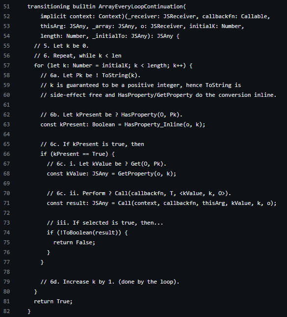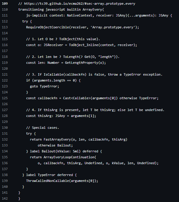 Torque 코드를 살펴보면 ECMA-262의 스펙대로 구현한 걸 볼 수 있다. 친절하게 주석까지 잘 달려있다.