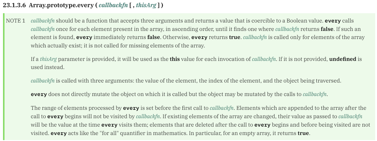 자바스크립트 every는 배열의 모든 요소가 제공된 함수로 구현된 테스트를 통과하는지 테스트하는 함수다. ECMA-262에 나와있는 every 함수의 스펙대로 이 기능을 자바스크립트로 구현해 보자.